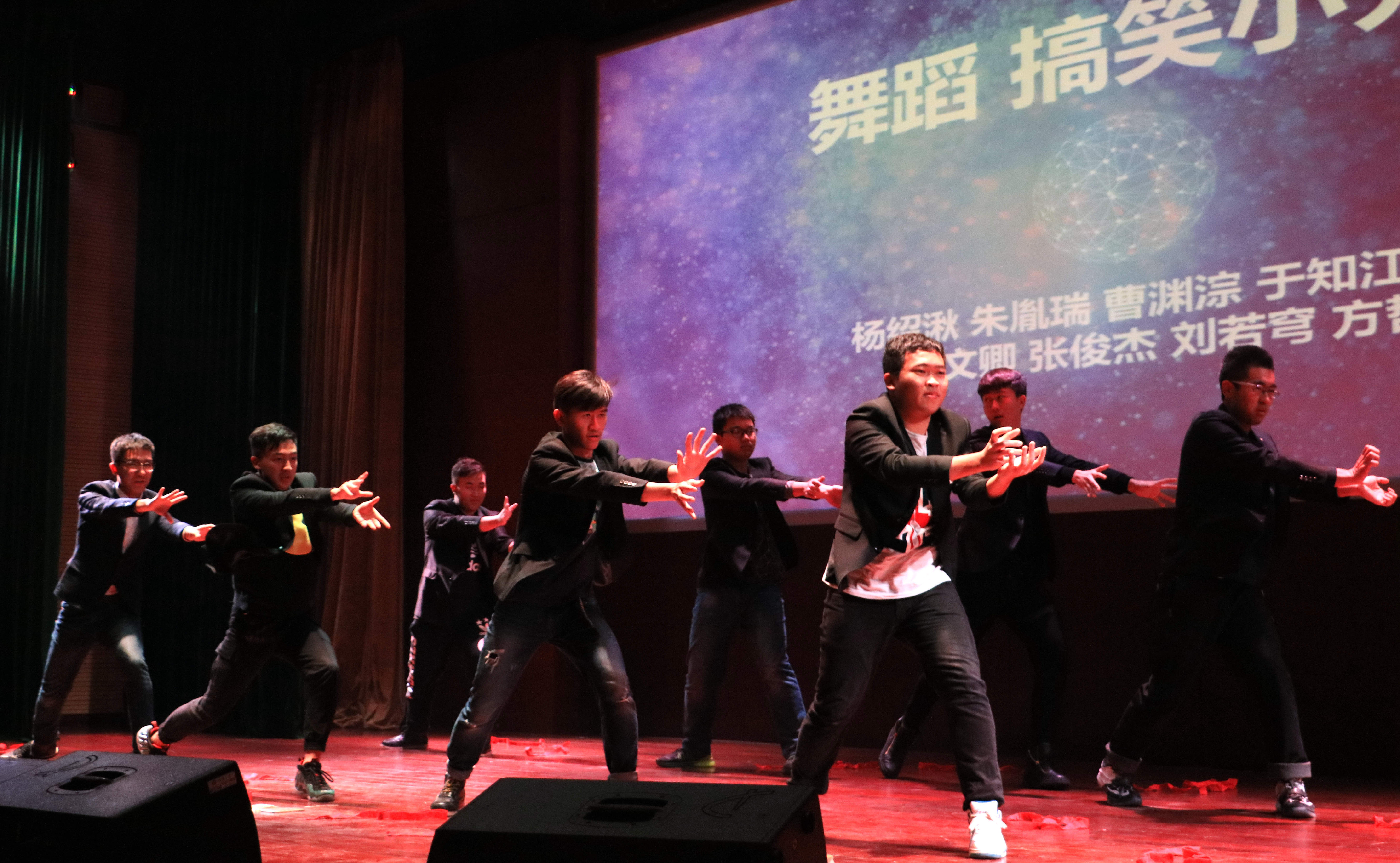 相声《社会主义核心价值观指导下轰轰烈烈的新诗歌运动》由“伉俪情深的相声先锋队”表演,有趣的段子惹得观众捧腹大笑。紧随其后的是搞笑小分队带来的舞蹈,九位男生搞怪的舞姿和新鲜的创意把全场推向了高潮。